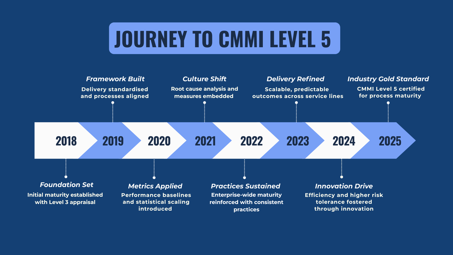 Para a ADROSONIC, o caminho para o nível 5 do CMMI tem sido uma progressão deliberada, a cada ano sentindo uma base mais sólida para a precisão, a escalabilidade e a inovação.